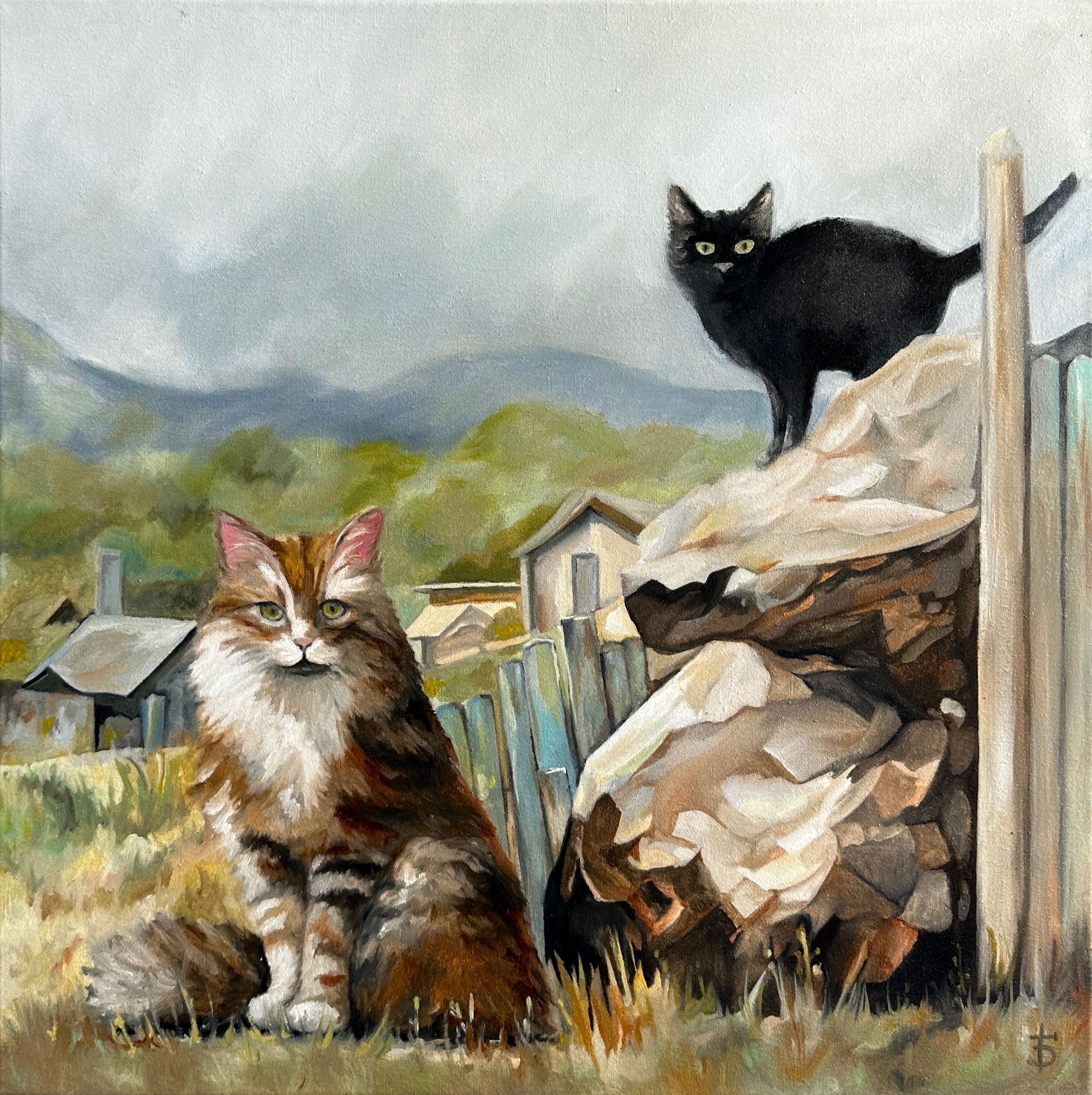 Das Gemälde „Guardian“ ist nicht nur ein Porträt von zwei Katzen vor einer ländlichen Landschaft. Es erzählt eine Geschichte von Stärke, Verantwortung und stiller Unterstützung, die unbemerkt, aber lebenswichtig bleibt.