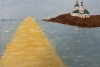 Ein heller Sonnenstrahl, der durch den morgendlichen Dunst bricht, beleuchtet die Wasseroberfläche und schafft diagonal von der unteren linken Ecke einen gelb-orangefarbenen Lichtweg. Er kontrastiert mit den sanften, türkisfarbenen Schattierungen des übrigen Wassers, auf dem seltene Lichtreflexe sichtbar sind, wie eine Spiegelung der ersten Sonnenstrahlen. Am rechten Ufer, über einer kleinen, dunkelbraunen Klippe thronend, befindet sich eine gemütliche Kirche mit zwei grünen Kuppeln, die mit Kreuzen gekrönt sind. Die schneeweißen Mauern des Tempels, geschmückt mit einfachen Bögen, vermitteln ein Gefühl von Frieden und Hoffnung. Die Farbgebung des Gemäldes ist in ruhigen, aber zugleich leuchtenden Tönen gehalten. Die blauen und hellblauen Schattierungen von Himmel und Wasser dominieren und stehen im Kontrast zum reichen goldenen Glanz des Sonnenwegs. Das Grün der Kuppeln fügt natürliche Frische hinzu, und der braune Felsen verleiht dem Bild Stabilität und Solidität. Die Beleuchtung ist weich, diffus, typisch für die Morgendämmerung. Sie erzeugt keine scharfen Schatten, sondern betont nur die Textur des Bildes. Der Stil des Gemäldes, einfach und manchmal naiv, vermittelt ein Gefühl von Aufrichtigkeit und Wärme. Die Atmosphäre des Gemäldes lädt zur Reflexion ein, ruft Ruhe und leichte Melancholie hervor. Die Komposition betont deutlich den Kontrast von Licht und Schatten, Wasser und Land. Die diagonale Linie des Sonnenwegs verleiht Dynamik, während die Kirche auf dem Hügel ein statisches, aber ansprechendes Element ist. Das Fehlen von Menschen unterstreicht die Erhabenheit der Natur und ihre Fähigkeit, die Welt mit den ersten Strahlen eines neuen Tages zu verwandeln.
