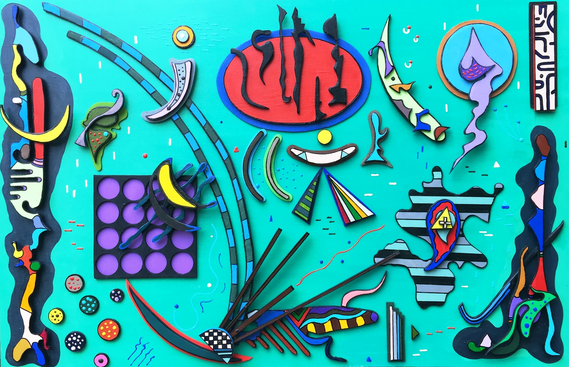 Стиль Куприянова в этой работе — виртуозное владение контрастами. Он смешивает чистую геометрию (круги, квадраты) с плавными, почти биологическими очертаниями. Цветовая палитра хоть и широка, но гармонична: холодный зелёный фон уравновешивается тёплыми акцентами красного и оранжевого, а глубокие тени от наложенных фигур усиливают ощущение глубины.