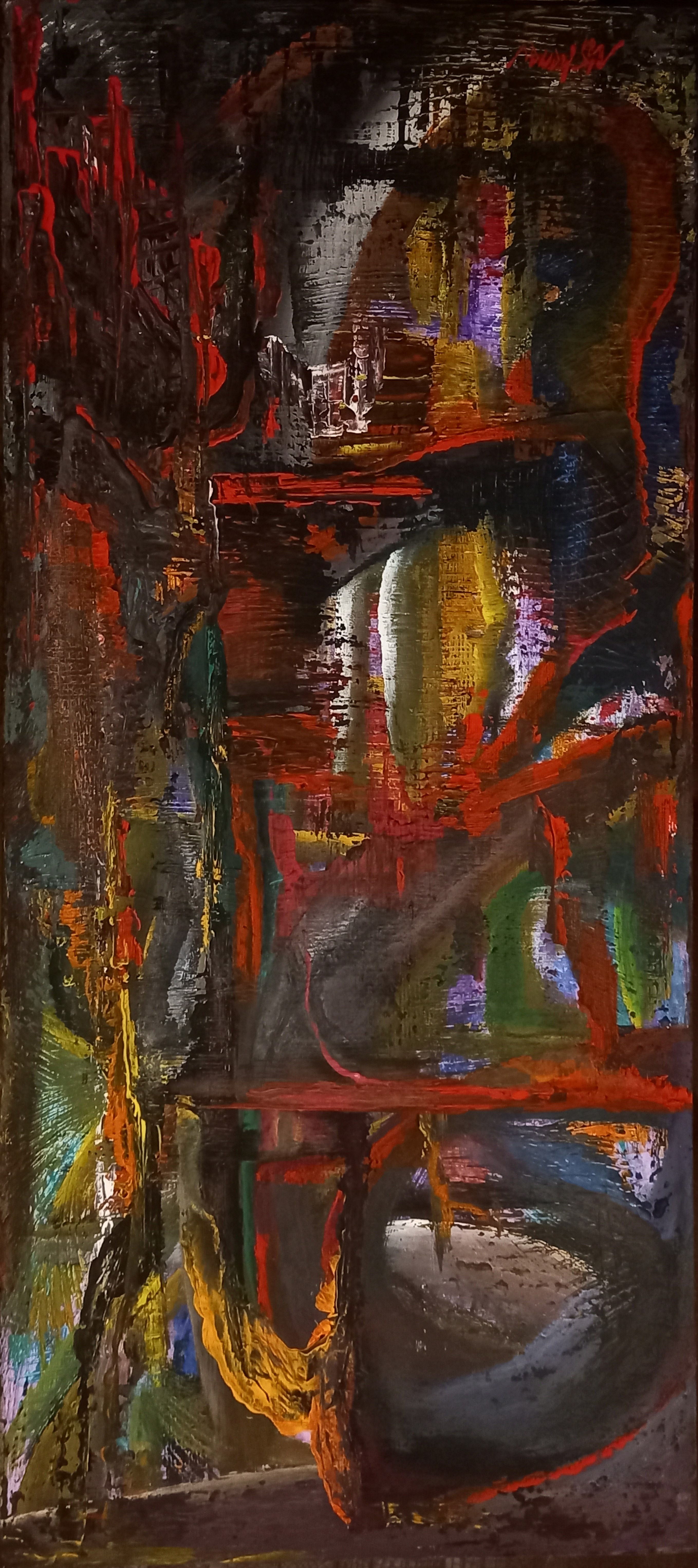 The painting is made on a fiberboard sheet with a stretcher bar attached. On the front side is a signature, on the back side is the title of the painting, year of creation, technique, and size.