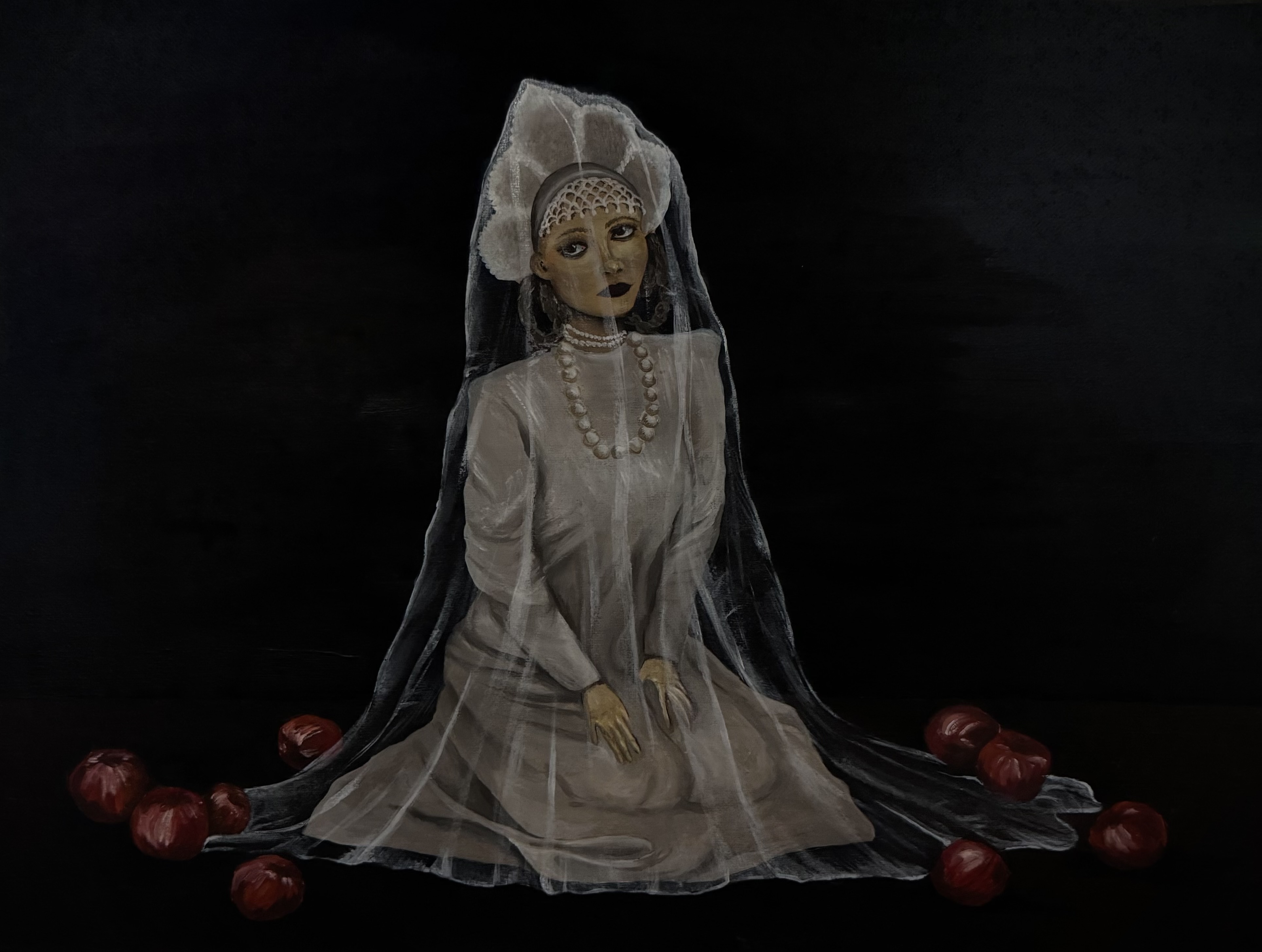 Die Arbeit untersucht das Thema weiblicher Identität durch die Linse von Ritual und innerer Isolation. Das Bild der Frau im Trauerschleier ist kein Porträt, sondern ein Archetyp: Braut, Heilige, Einsiedlerin, Schatten.