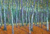 Сочетание серебристых холодных берез и мозаика из золотистых листьев между берез создают теплый осенний мотив.