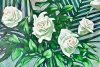 Белые розы на фоне рисунка листьев создают декоративность картины.
