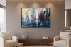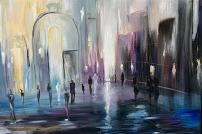 На полотне — городской пейзаж с силуэтами людей, растворяющихся в свете и цвете. Пространство словно наполнено мягким сиянием: теплые золотисто-сиреневые тона на левой стороне плавно переходят в глубокие фиолетово-синие справа, создавая ощущение движения — как будто день сменяется ночью или человек переходит из света в тень.