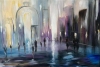 Архитектурные формы намечены условно — арки, фасады, отражения на мокрой мостовой. Фигуры людей не имеют черт — они скорее символы присутствия, ритм городской жизни, мгновение в потоке.
