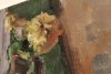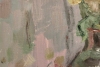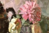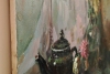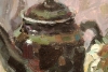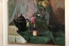 Das Gemälde ist in zarten und tiefen Tönen gehalten. Anmutige Drapierungen schaffen einen ausdrucksvollen Hintergrund für die Gegenstände, die mit feiner Farb- und Tonnuancierung dargestellt sind. Es vermittelt ein Gefühl für das Material der dargestellten Objekte. Der Kontrast von Rosa und Grün im Stillleben macht die gesamte Komposition elegant und malerisch. Der freie, aber präzise Pinselstrich erinnert an den Stil der französischen Impressionisten, die, um die Gegenstände wahrheitsgetreu und realistisch darzustellen, dies auf eine malerische, „lässige“ Weise taten, die es ermöglichte, eine ausdrucksstarke Oberflächenstruktur des Gemäldes zu schaffen und ihren Werken Dynamik und Lebendigkeit zu verleihen.