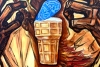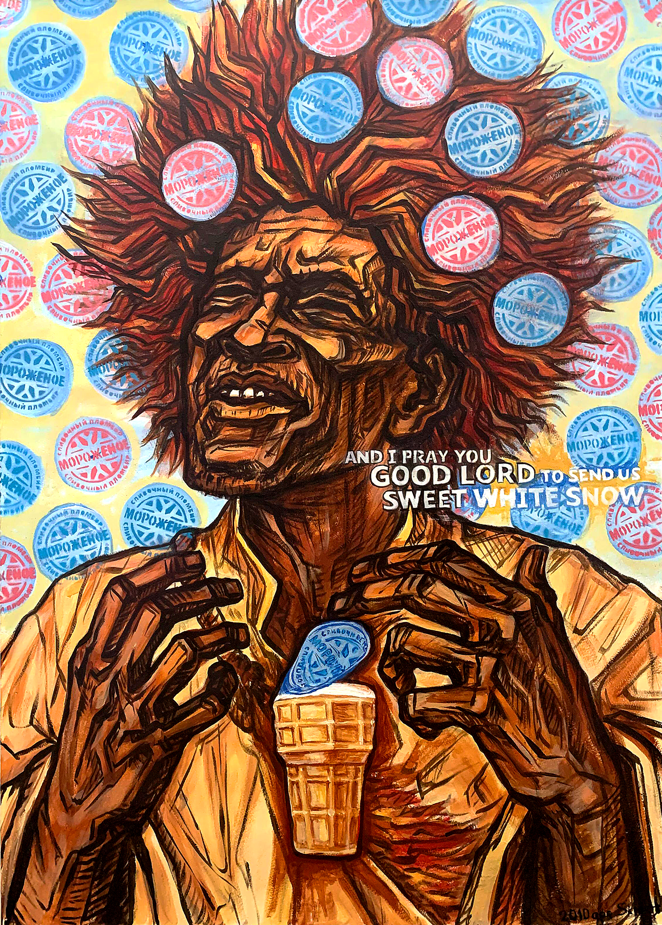 Однажды я посмотрел документальный фильм о Вуду колдунах, способных творить чудеса и исцелять. Так появился этот Африканский колдун. Он воздел руки к небу, умоляя Всевышнего ниспослать ему благодать в виде белого снега. И его молитвы были услышаны. С неба падают обертки от мороженого, предвещая появление самого мороженого во всех деревнях. Перед колдуном материализуется вафельный стаканчик с мороженым. Так он добыл источник радости для всех, а не только избавление от засухи и жажды.