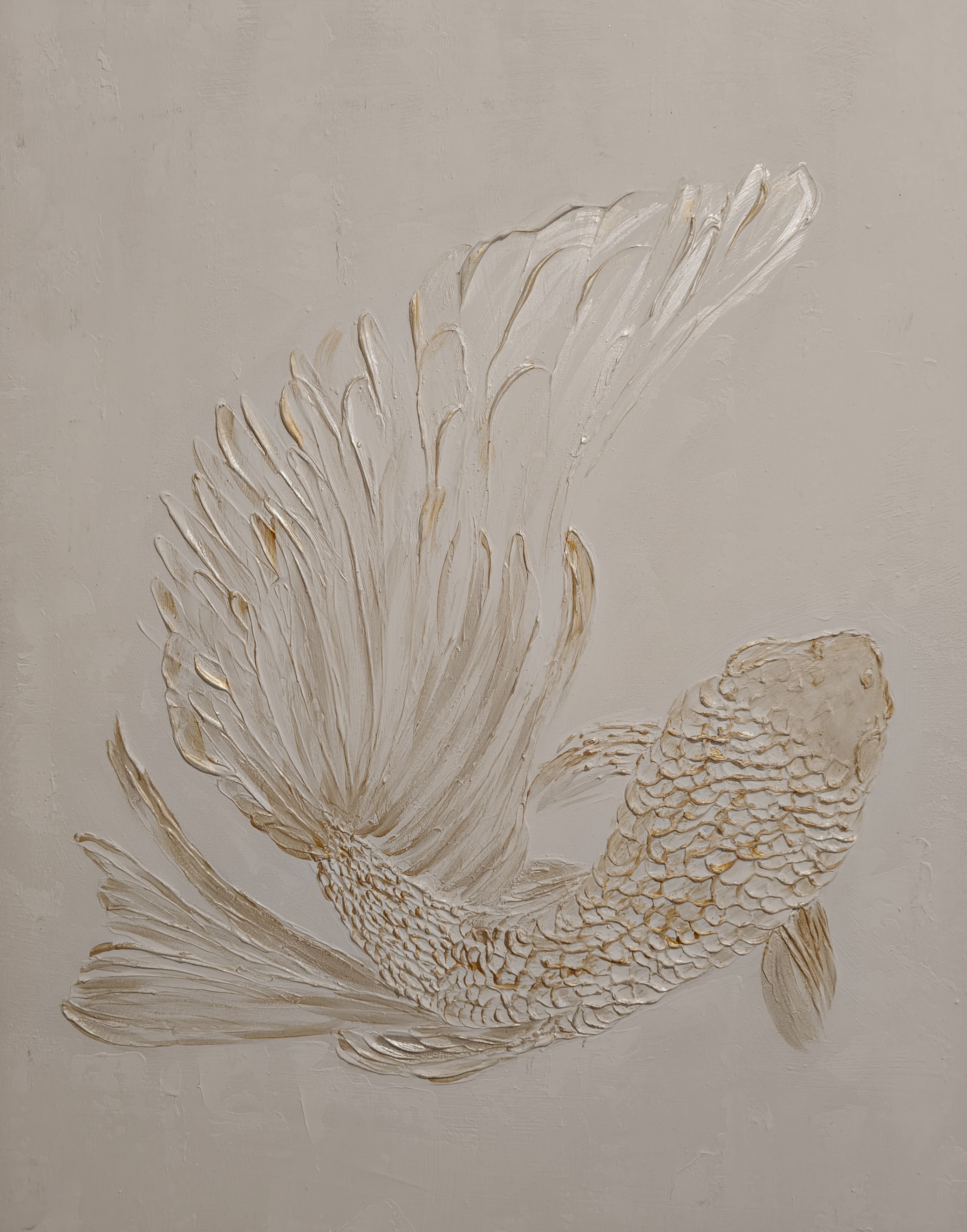 Das Bild für die Inneneinrichtung wurde in einer Mischtechnik mit Strukturpaste, Acryl und Blattgold gefertigt.