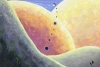 Die fantastische Landschaft zeigt dem Betrachter den Aufgang riesiger Himmelskörper zwischen den Berggipfeln.