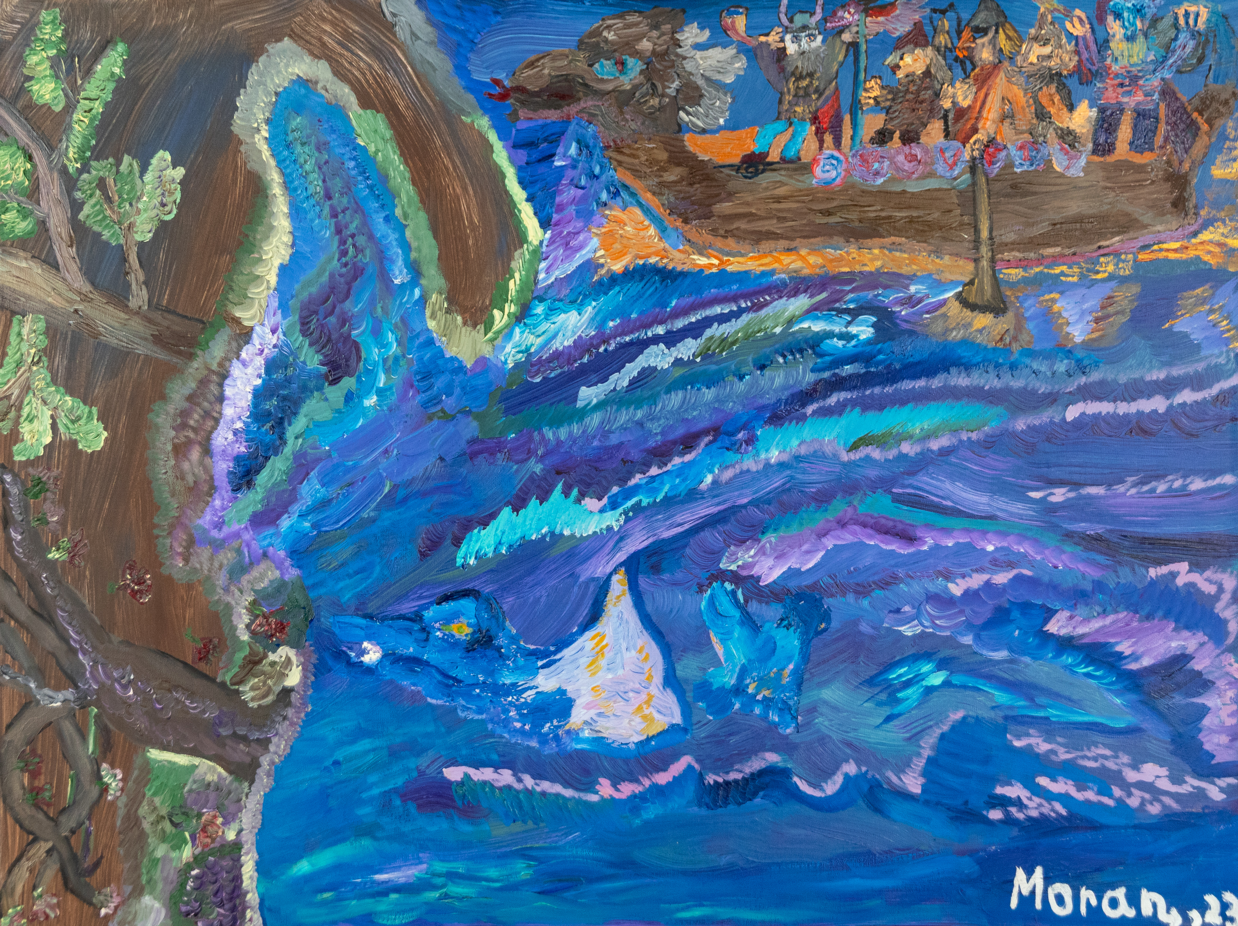 «Новый Свет » — ein Ölgemälde (60×80 cm) im abstrakten impressionistischen Stil, das den Betrachter in eine geheimnisvolle Atmosphäre eintauchen lässt. Türkisfarbene und violette Flusswellen, die den Himmel spiegeln, kontrastieren mit den heißen orangefarbenen und roten Tönen des Ufers, wo sich Silhouetten von Menschen bewegen. Details — Baumzweige, Blumen am Baumstumpf, verspielte Lichtstrahlen — erzeugen ein Gefühl von Bewegung und Mystik. Das Gemälde wird eine ideale Ergänzung für das Wohnzimmer, das Arbeitszimmer oder ein Museum sein und dem Interieur eine Note von Exotik und emotionaler Tiefe verleihen.