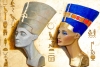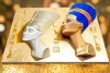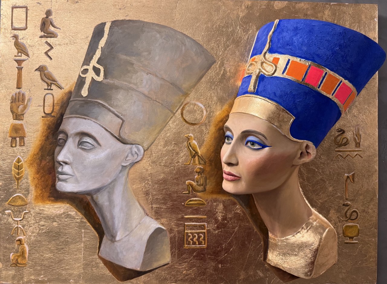 Walerij Baranow's painting harmoniously combines elements of sculpture and painting, embodied on a plywood panel with a golden background. The central figures of the image are two female portraits in profile, inspired by the famous bust of Nefertiti—an icon of ancient Egyptian art.