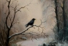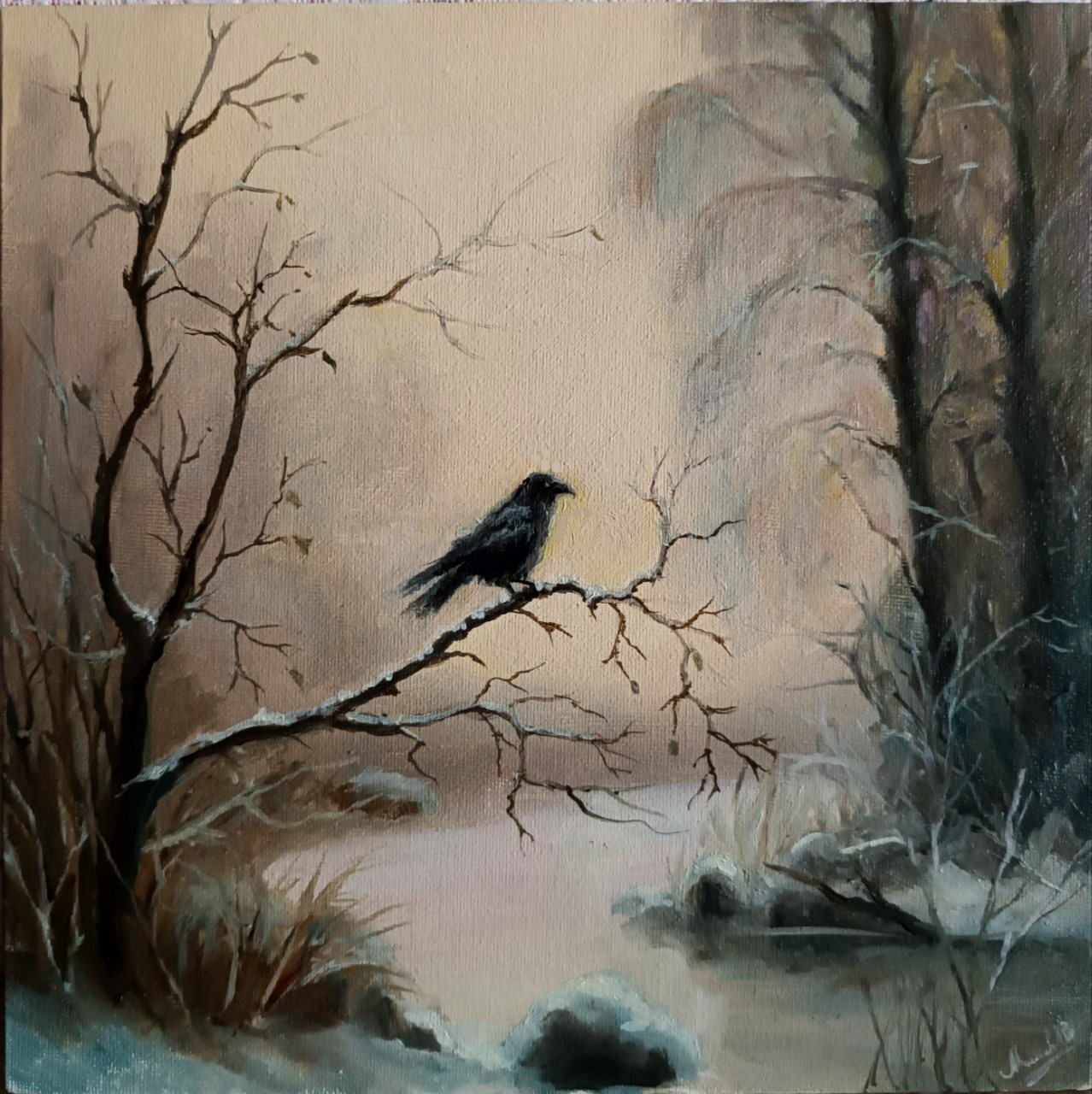 На картине изображена зимняя сцена в лесу. В центре композиции сидит чёрный ворон на голой ветке дерева. Ветка тонкая, без листьев, с мелкими сучками. На заднем плане видны другие деревья, также без листвы, создающие мрачную атмосферу. Внизу картины можно увидеть замёрзшую реку или ручей, покрытый снегом и льдом. На переднем плане изображены кусты и трава, припорошенные снегом. Цветовая гамма картины преимущественно холодная, с оттенками серого, белого и чёрного, что создаёт ощущение зимнего холода и тишины.