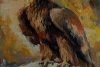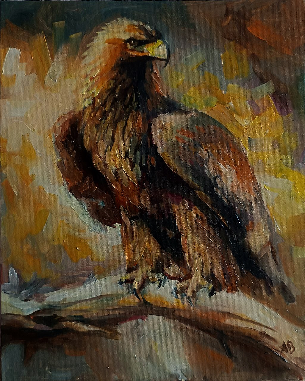 На картине изображен орел, сидящий на ветке. Птица выполнена в теплых коричневых и золотистых тонах, что придает ей величественный и благородный вид. Фон картины размыт, с преобладанием желтых и коричневых оттенков, что создает ощущение осеннего леса. Художник использовал мазки разной интенсивности, что добавляет динамичности и глубины изображению. В правом нижнем углу картины видна подпись автора.