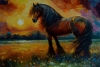На картине изображён величественный конь с длинной тёмной гривой и хвостом, стоящий на зелёном лугу, покрытом цветами. Конь расположен в центре композиции, его силуэт чётко выделяется на фоне заката. Небо окрашено в яркие оттенки оранжевого, жёлтого и фиолетового, создавая контраст с тёмным силуэтом коня. Вдали виднеется линия горизонта, где небо встречается с землёй. На заднем плане можно увидеть силуэты деревьев, которые добавляют глубину и перспективу картине. Вся сцена наполнена тёплыми и яркими красками, создавая атмосферу спокойствия и умиротворения.