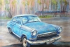 An old blue car against the backdrop of a spring cityscape with buildings and trees melting into the air. A nostalgic anchor in the fleeting flow of time.