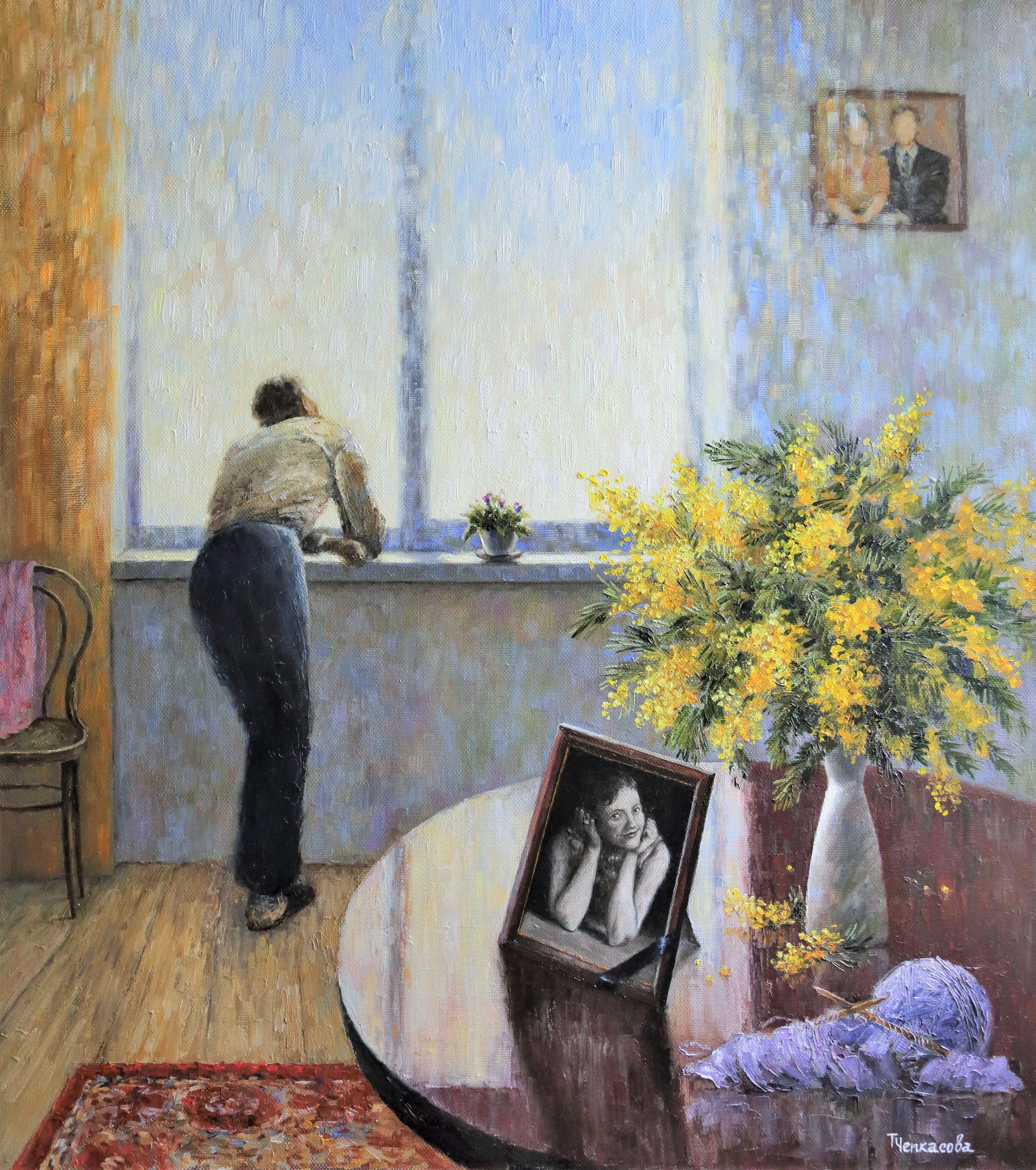 Герой сюжета – человек, потерявший жену. Он стоит у окна, растворяясь в свете. На подоконнике фиалка: у древних греков фиалка считалась цветком печали и смерти, но также была эмблемой пробуждения природы. На столе – незаконченное вязание и букет мимозы. Мимоза – это один из видов акации, она одной из первых зацветает после зимних холодов. Жёлтые цветы мимозы символизируют солнечный свет и волю к жизни. В Древнем Египте акацию считали «древом жизни», в христианской традиции она является символом бессмертия души и воскресения. Это работа о любви, о жизни и смерти.