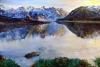 The central motif of the painting is the majestic mountain ranges, whose peaks, covered with eternal snow, reach toward the sky. Their powerful silhouettes, painted with thick, energetic strokes of blue, white, and golden hues, create a sense of epic scale. But the main magic of the canvas lies in the reflection: the mirror-like surface of the water perfectly duplicates the mountains, blurring the boundaries between reality and its reflection. This «doubling» effect enhances the feeling of deep, meditative silence.