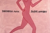 Центральным элементом композиции является стилизованная фигура женщины, выполненная в ярком, насыщенном розовом цвете. Она изображена в движении, идущей или бегущей, что символизирует активное стремление к цели. Её поза полна энергии и решимости.