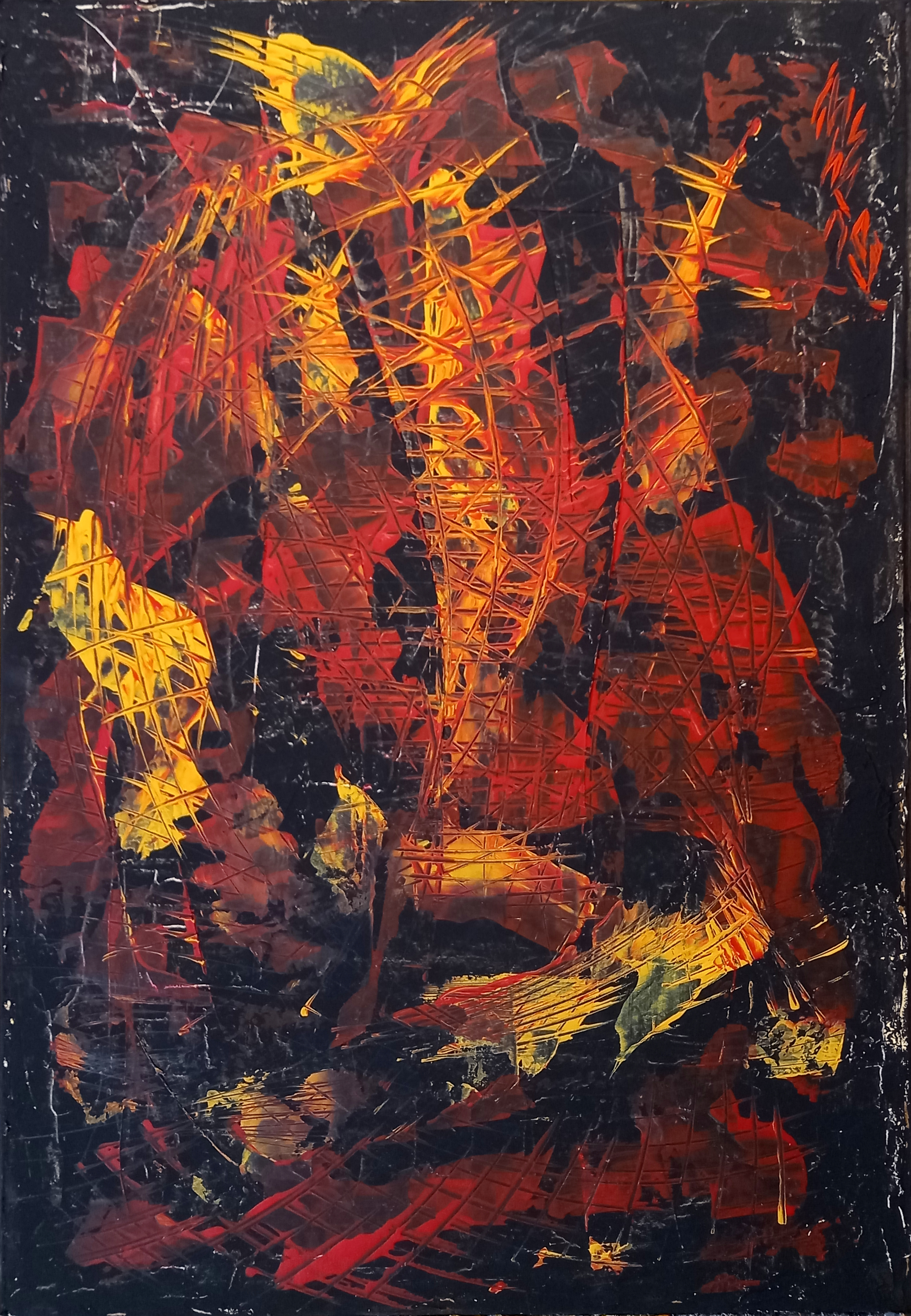 The painting is made on a fiberboard sheet with a stretcher bar attached. On the front side is a signature, on the back side is the title of the painting, year of creation, technique, and size.