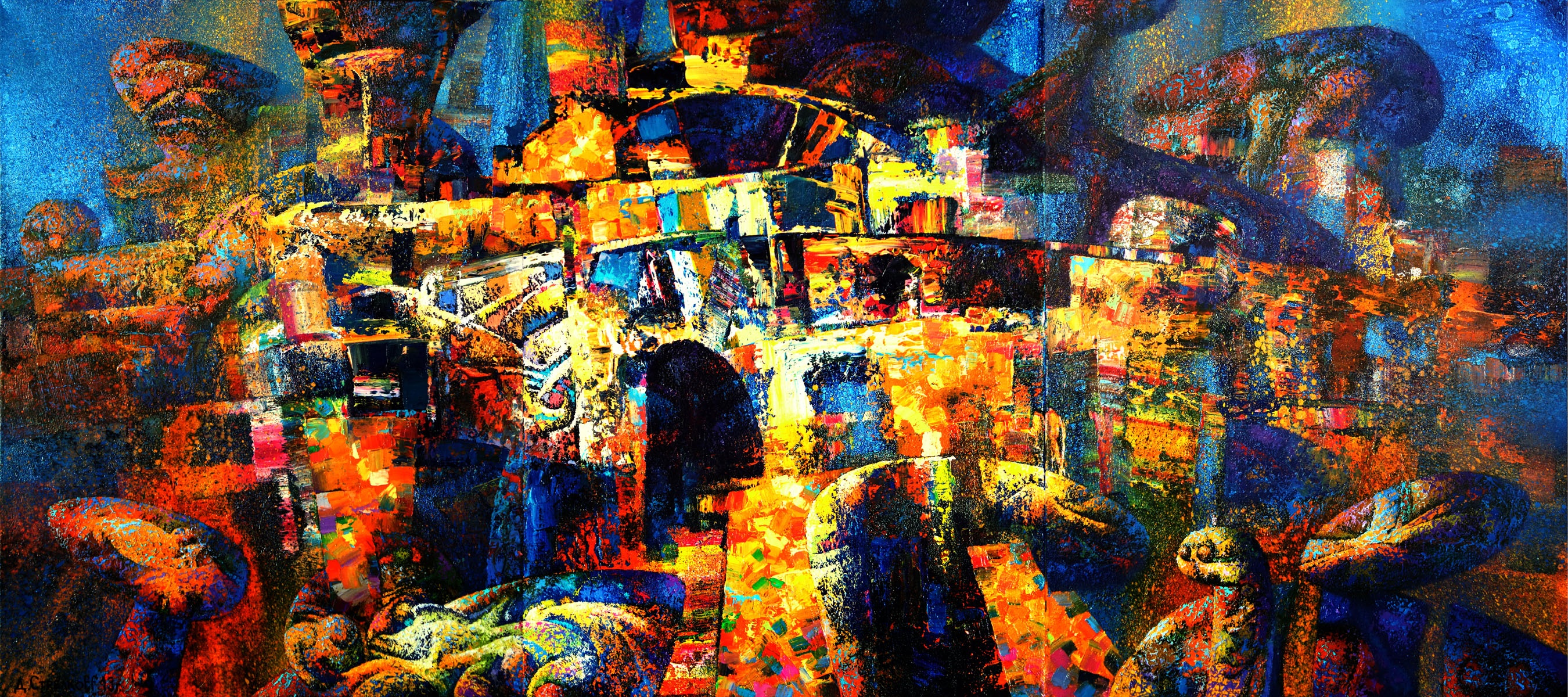 Абстрактная картина, созданная масляными красками на холсте в уникальной авторской художественной манере под названием "Абстрактный эклектизм". Насыщение плоскости картины разнообразнейшими живописными приёмами, фактурами и текстурами вкупе с экспрессивным, динамичным композиционным построением позволяет художнику создать свой особый, неповторимый многомерный мир, видеть, изучать и познавать который можно как в целом на расстоянии, так и вглядываясь в каждый сантиметр изображения.