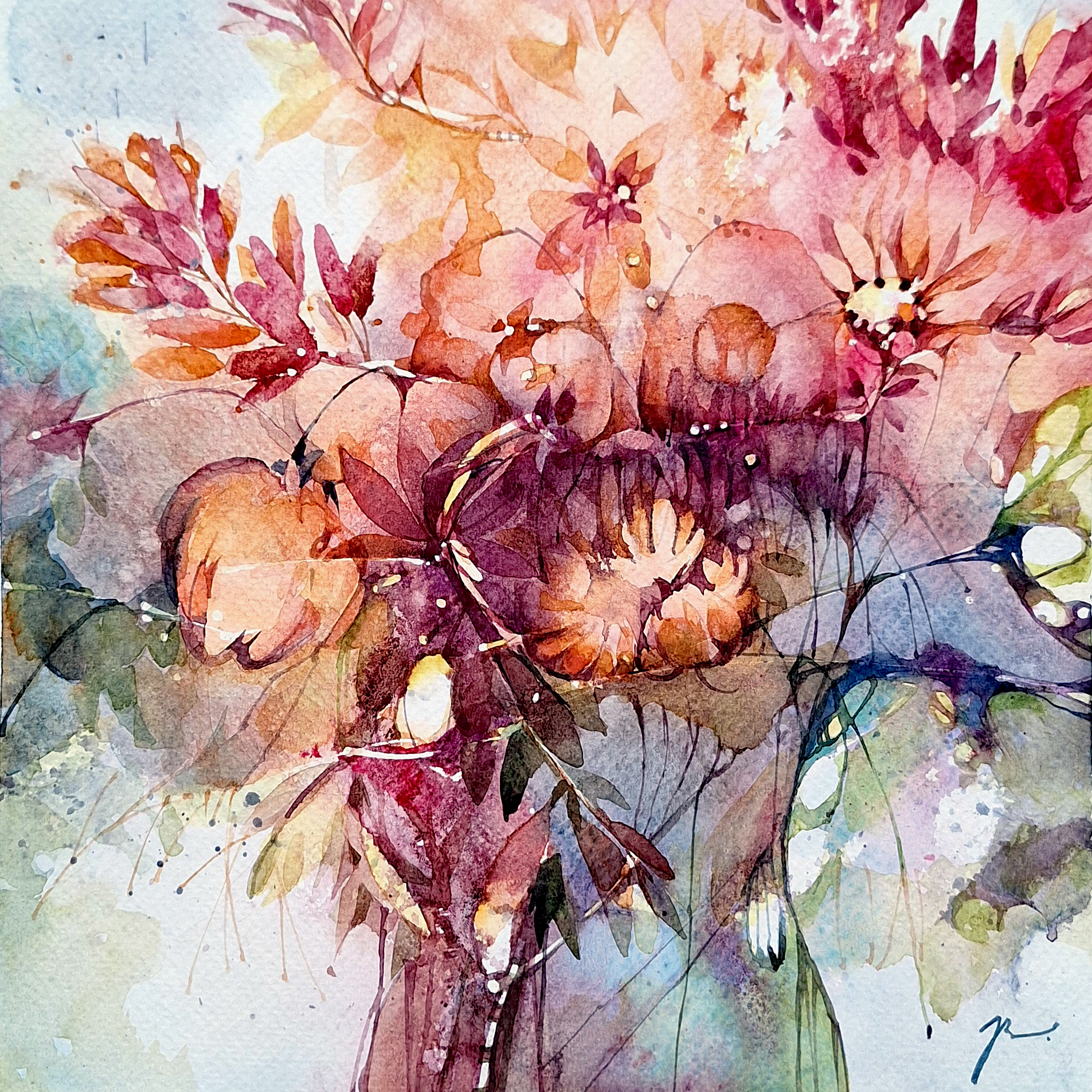 Эта картина началась с хаоса — чистой воды и ярких пятен, — а закончилась тонкой игрой образов, в которой мне показался то букет, то цветочный крест. Мне нравится мысль о том, что случайность в искусстве — это не ошибка, а диалог с неизвестным. Иногда случай подсказывает верное направление, и ты просто следуешь за ним, уточняя, добавляя, вслушиваясь в то, что рождается на бумаге.