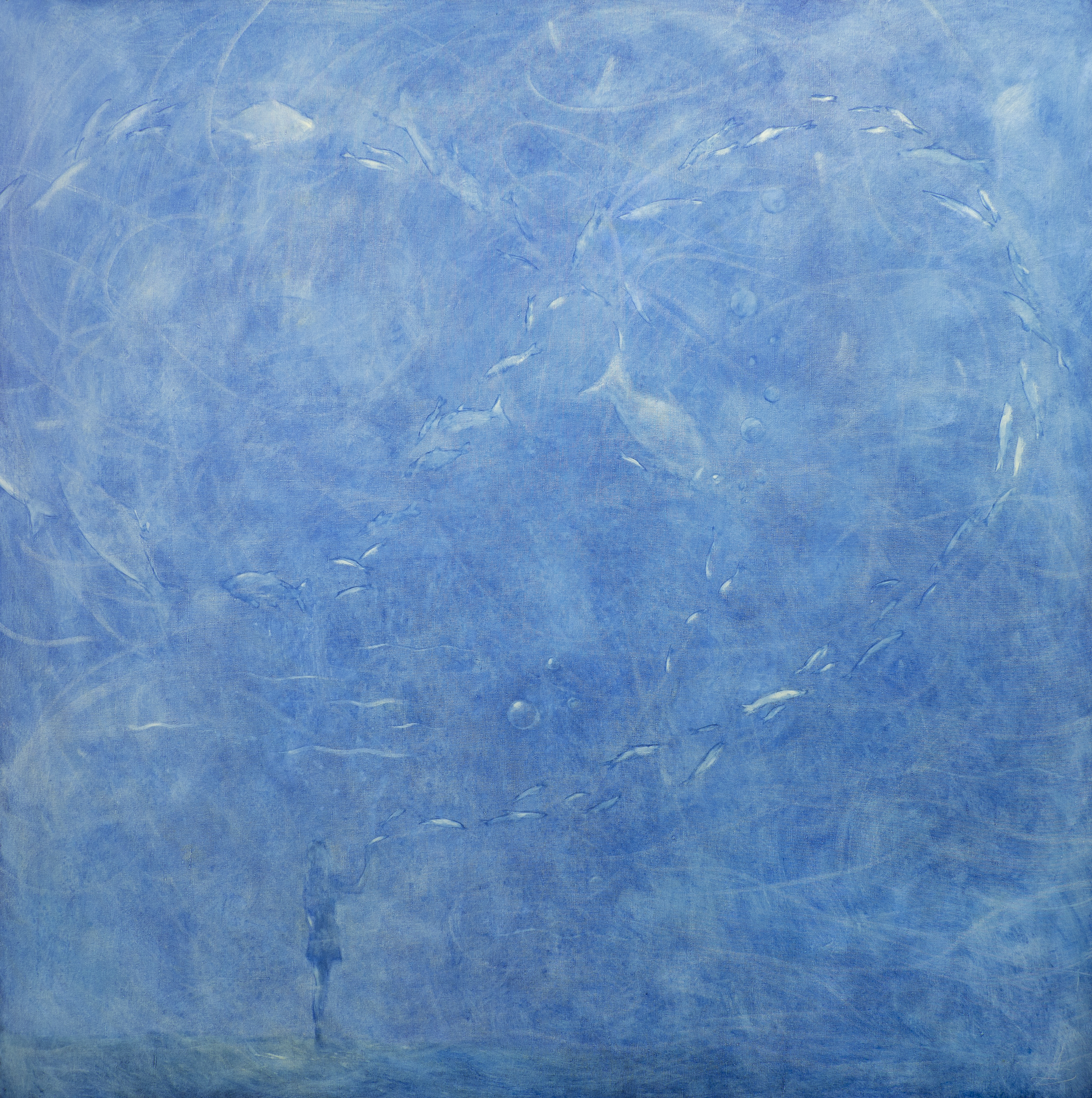 The painting is part of the "Sea of the Sea" series. It depicts a silhouette of a girl, with fish moving around her, both large and small. The fish are circling in a dance, forming an infinity symbol. This painting is a philosophical reflection on the artist's personal history. For the viewer, it offers a chance to delve into their own thoughts and associations with the artwork.