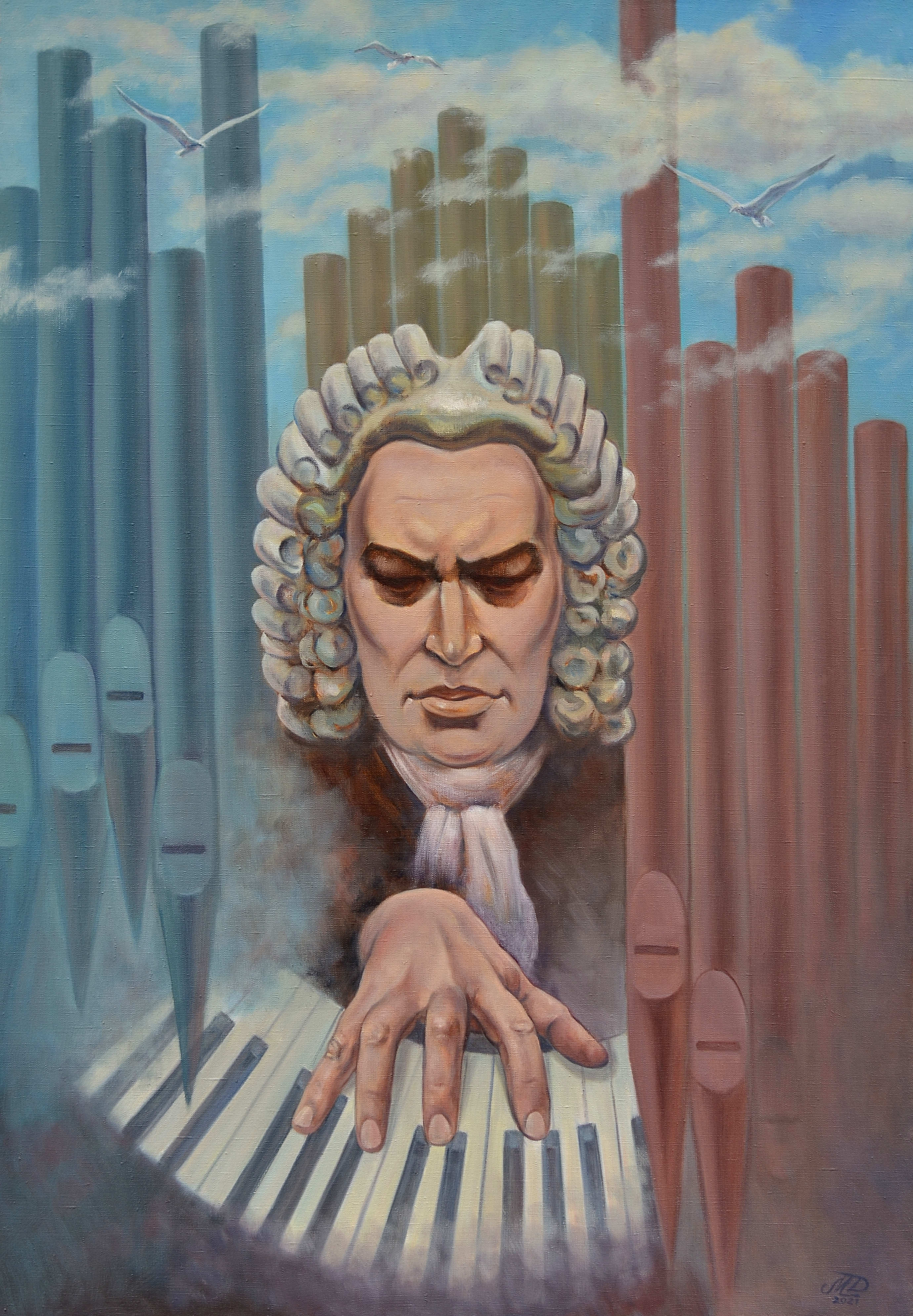 На картине изображён Великий композитор Бах,в момент игры на органе. Написана одна рука,которая сосредотачивает внимание на центре композиции и более остро передаёт игру и мысль гения. Портрет передан из исторических источников.