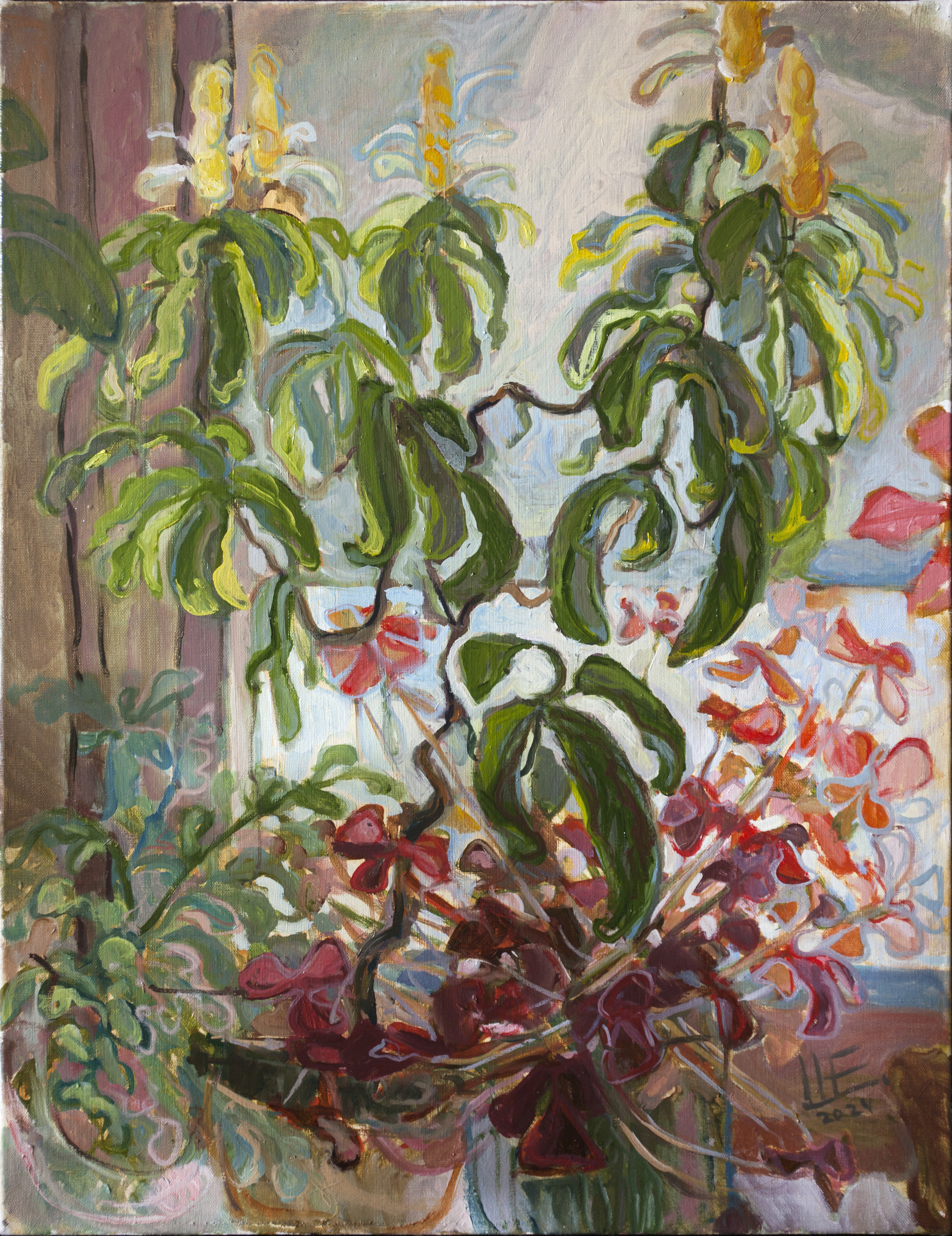 Здесь много света и запечатленного состояния любви и мыслей о высоком. Смотрю на растение-подсвечник – и оно дарит мне свой золотой свет, дополняю ощущение бордово-красными трилистниками – в душе поселяется мысль о святой Троице. И вот, появляется незаметный и скромный участник изображения, он текучий и неустойчивый, загадочный и ранимый, быть может это намек на человека, стремящегося к Божественному свету, который есть – его скрытая внутренняя суть.