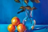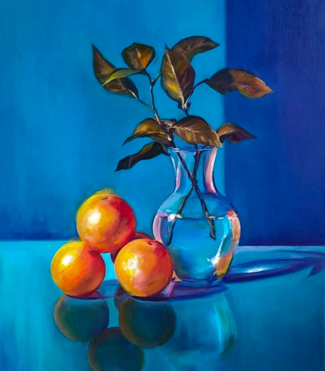 Это произведение выполнено на холсте с применением ярких масляных красок, создающих эффект преломления света. Картина датирована 2025 годом и отражает солнечное освещение в интерьере с акцентом на фруктах и стеклянном сосуде. Работа дополнена тщательно обработанной цветовой гаммой, объединяющей составляющие синего, оранжевого и желтого, подчёркивающие спелость и свежесть натюрморта.