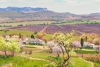 The central focus of the composition is the blooming trees in the foreground, whose delicate whiteness and pink hues beautifully contrast with the lush, bright green grass. The viewer’s gaze smoothly moves to the endless rows of vineyards stretching to the horizon, where majestic mountains complete this harmonious landscape.