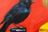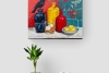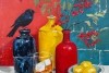 Картина «Рябина и галка» — это выразительный натюрморт, наполненный символами, цветом и контрастом. На фоне насыщенных оттенков красного и морской волны раскрывается необычная композиция: ветка алой рябины, две глиняные бутылки — красная и желтая, и темная бутыль глубокого, почти черного цвета. На ней, словно хранитель тишины, сидит черная галка. На столе перед ними — тарелка с яркими, сочными лимонами, источающими солнечный свет.