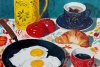 Картина «Завтрак на цветочной скатерти» наполнена теплом утреннего света и радостью простых моментов. На яркой цветочной скатерти изображены чашка кофе, свежий круассан и сковородка с яичницей — уютный завтрак, созданный с любовью. Яркие красные помидоры добавляют композиции энергии и жизненности.