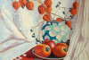 Draperies and a striped rug set the rhythm and depth. The painterly technique — even color fills, localized brushstrokes, and subdued texture — makes the painting decorative and suitable for interior decoration. Overall, a warm, sunny palette, a harmonious combination of warmth and coolness, richness and lightness.