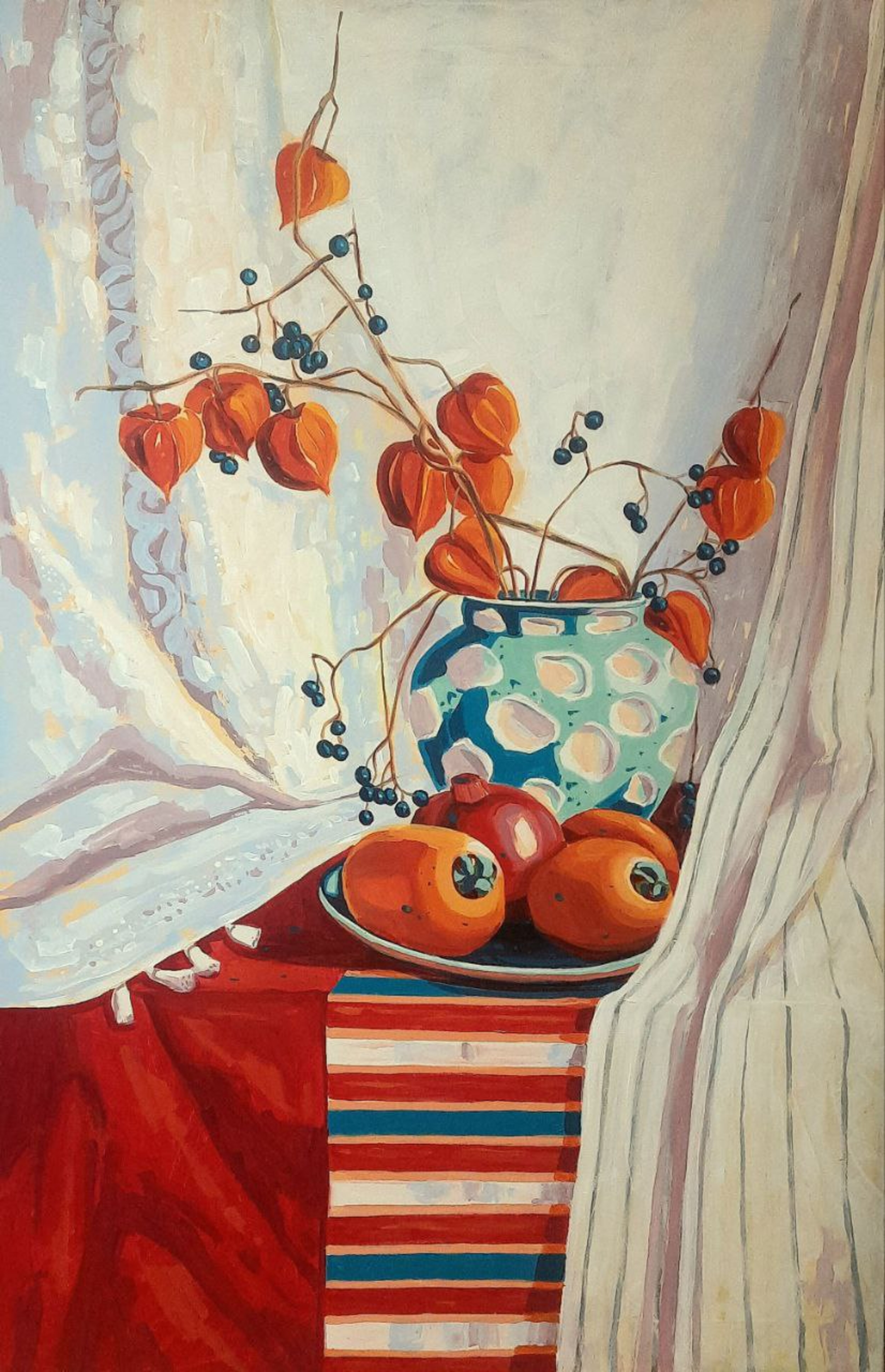90*60 cm. Acrylic, canvas on stretcher frame for Russia, other countries - without stretcher frame. Decorative contemporary still life with elements of naive and post-impressionist style: flat color spots, simplified forms, and emphasis on rhythm and ornament — an image built on color and composition.