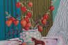 • Flat, saturated color spots and noticeable brushstrokes create a sense of handmade, original work. The contrast between the warm orange-red "lanterns" of the plants and the cool turquoise-green backgrounds adds depth and rhythm.