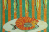 Naive/illustrative folk style with elements of retro-modern; restrained, rich palette (sea turquoise, coral/orange, cream); soft, kind surrealistic scene. Graphic vertical stripes of deep turquoise-green and warm coral set a steady rhythm, while the central image — a striped cat curled up on a fish — acts as a cute, slightly surreal hero. The accent cord at the top and the "hanging" fish add texture and theatricality, like a scene from a children's book. Conveys comfort and calm satisfaction (the cat sleeps peacefully — a symbol of security and mild contentment);