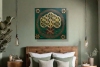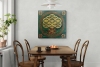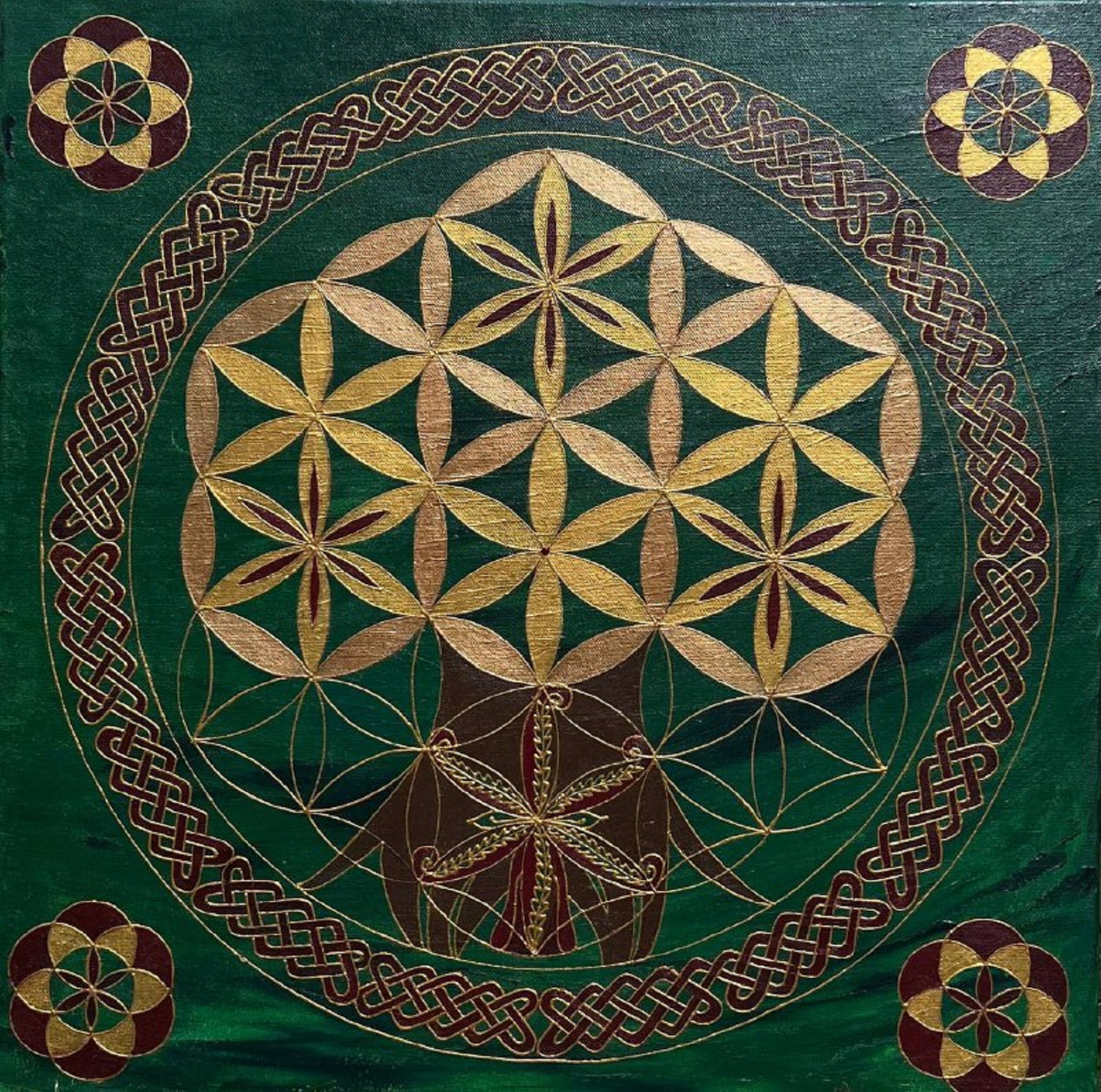 The symbols of the seed of life along the edges of the painting represent the fruits that naturally arise from the union of two human principles: the power of one’s Family Line and the connection with the inner Core.