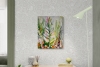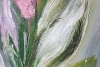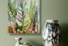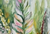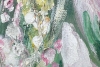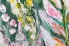 A vibrant acrylic painting in the Impressionist style. The detailed work depicts a large central leaf surrounded by a floral abundance, set against tall trees in shades of pink, white, and green. The composition conveys the energy of nature on a sunny day through bold strokes and a harmonious palette, creating a sense of freshness and admiration for the world.