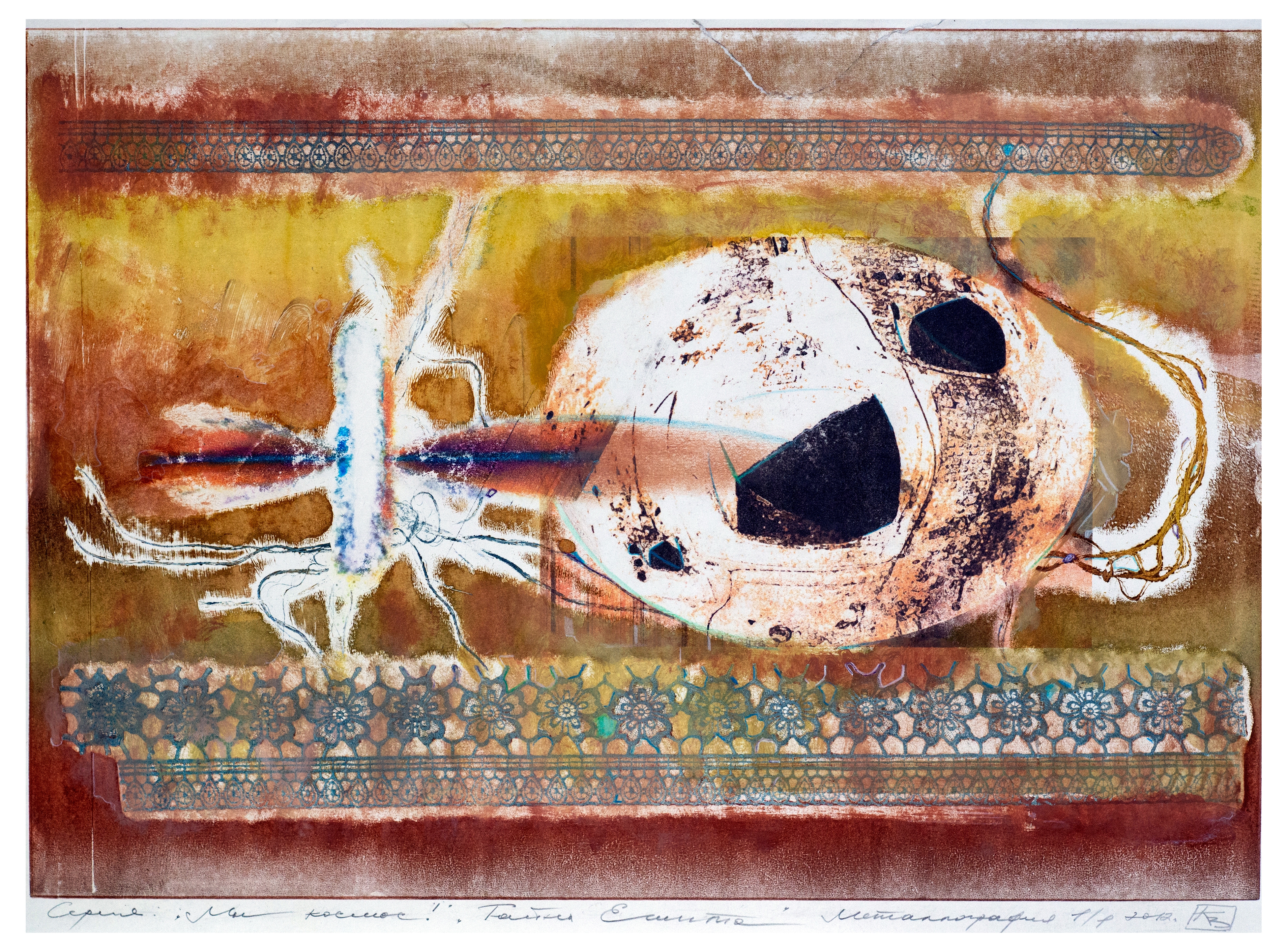 At the center of the composition is a stylized image reminiscent of an ancient Egyptian symbol or artifact. Its texture, created through metallography, gives the work a special depth and materiality, as if time itself has been captured on the canvas. Bright yet subdued shades of yellow, brown, and blue create an atmosphere of mystery and antiquity. Patterns resembling ornamental elements of Egyptian frescoes frame the central image, emphasizing its archaic nature and cultural significance.