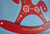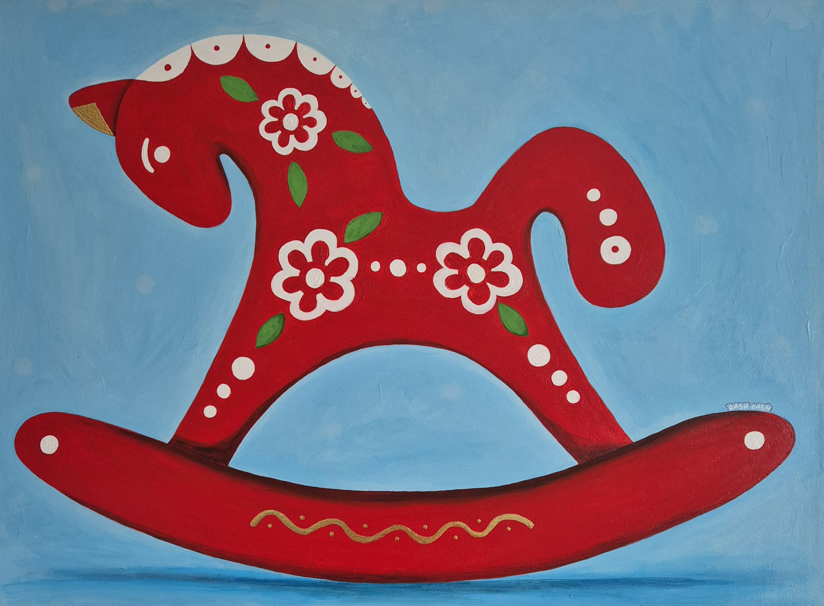 At the center of the composition is a bright red rocking horse, crafted in a style reminiscent of Russian folk toys. Its silhouette is simple and concise, yet full of life and movement. The surface of the horse is decorated with ornamental elements: white flowers with red centers, green leaves, dots, and a wavy golden line at the base. These patterns, executed with the spontaneity characteristic of folk art, give the horse a special charm and appeal.