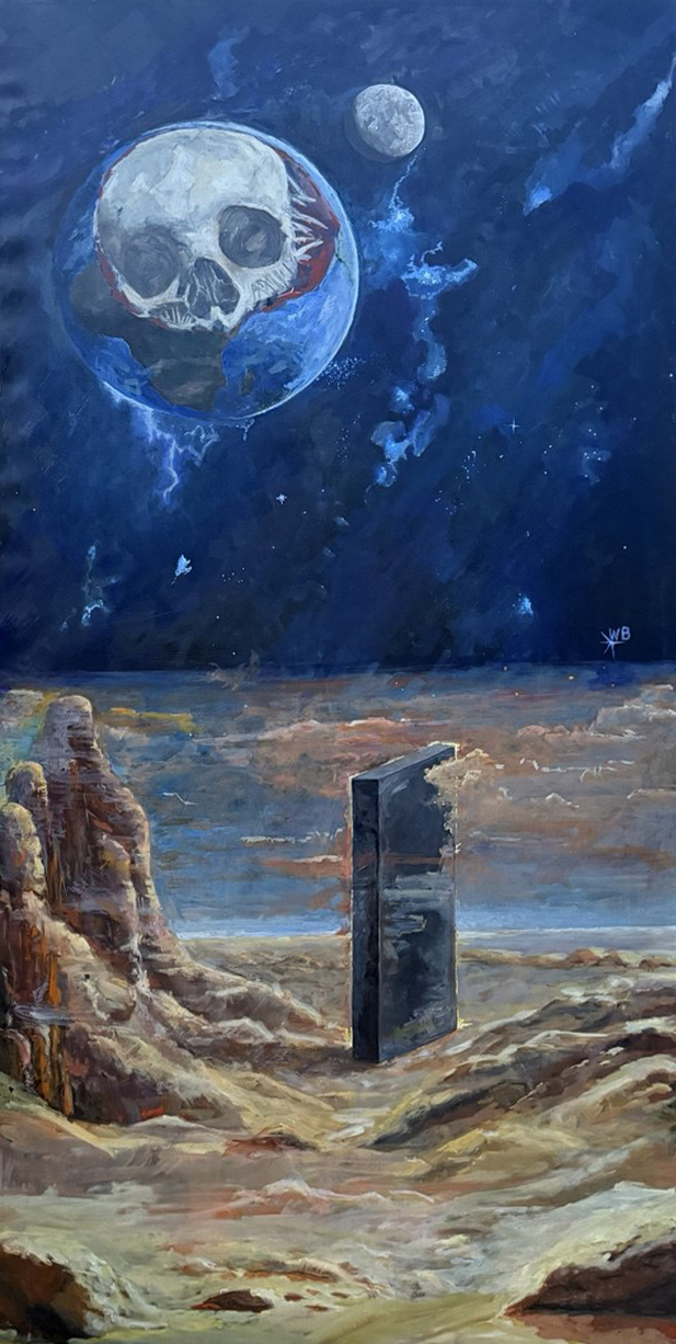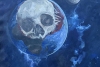 Картина "Odyssey X" поражает своим мощным символизмом и тревожной атмосферой. В центральной части изображена Земля в виде шара, контуры которого внезапно превращаются в череп. Мрачный череп с пустыми глазницами словно возникает сквозь очертания планеты, подчеркивая неразрывную связь между жизнью и смертельными угрозами.