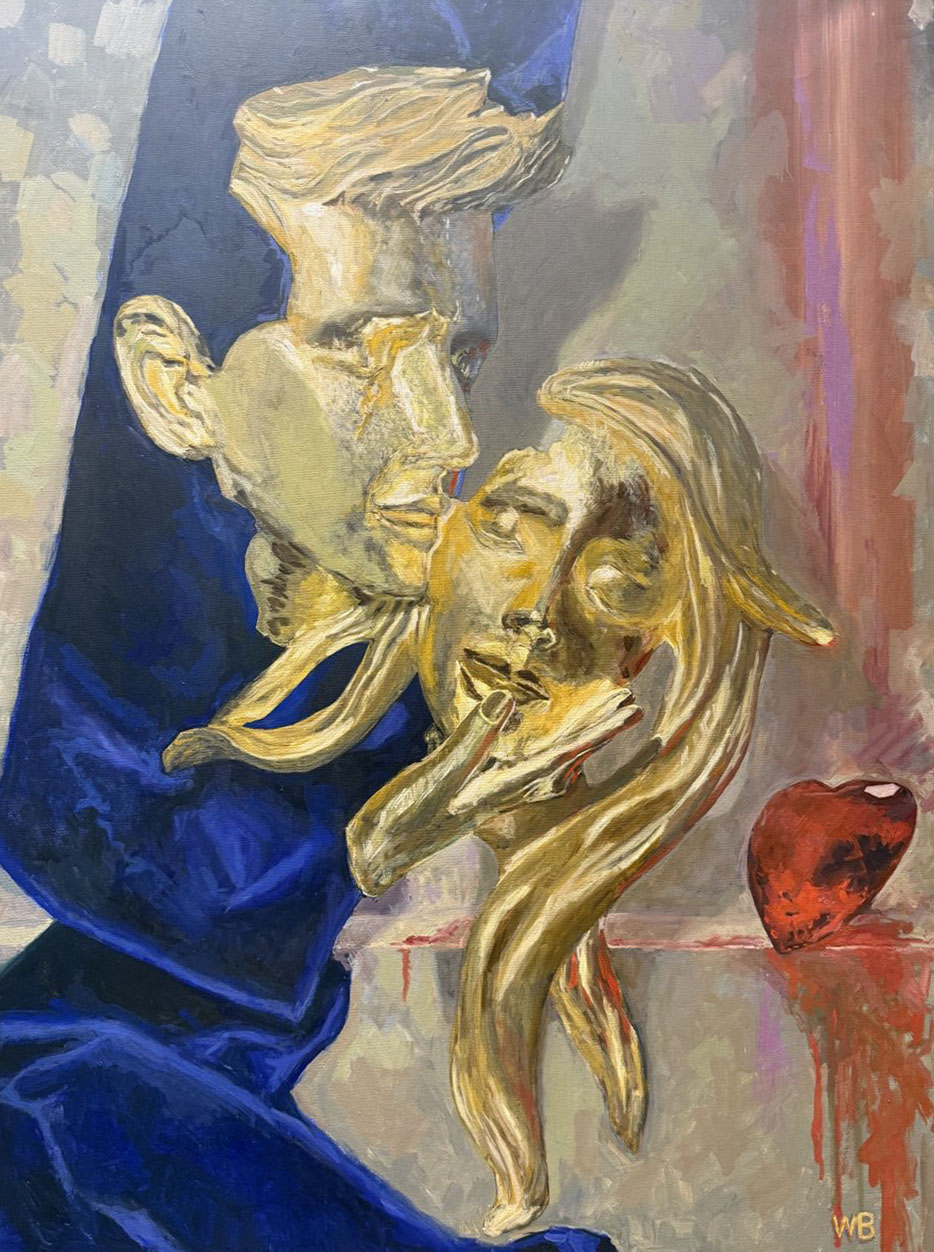 Картина Валерия Баранова «Ruby» представляет собой сложную и многогранную композицию, в которой художник исследует темы любви, страсти, чувственности, а также хрупкости и ценности отношений. Используя яркую, но приглушённую цветовую палитру и приемы стилизации, он создаёт атмосферу романтики, тайны и некоторой драмы, характерной для темы любви. Это не просто изображение целующихся фигур и рубина, а визуальная метафора силы и одновременно уязвимости любящих чувств, их способности приносить радость и боль, а также ценности каждого проведённого вместе момента.