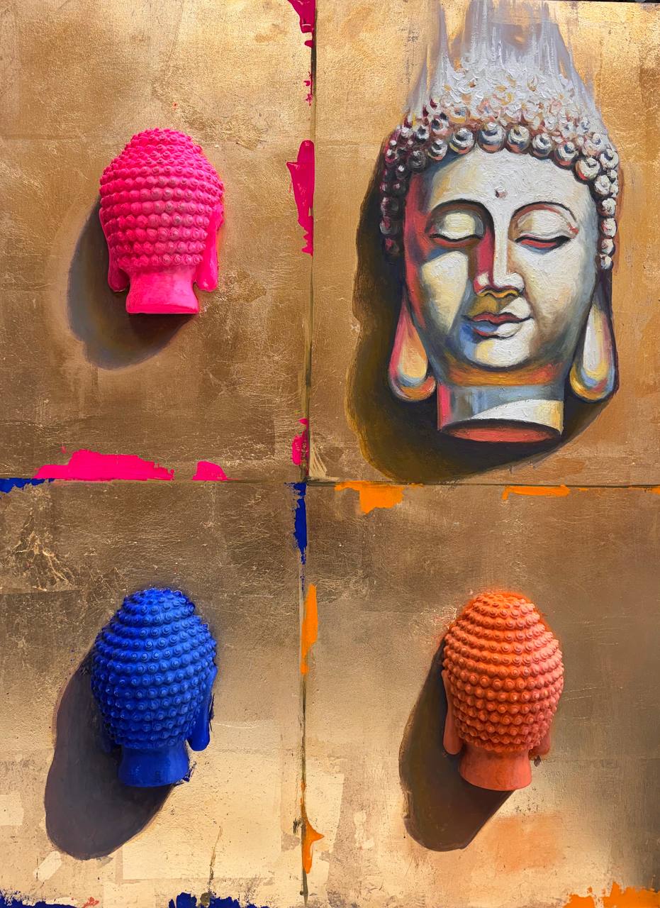 The painting by Walerij Baranow «All Buddha» is a profound, multifaceted piece executed in mixed media (plaster, oil, gold leaf/wood), exploring themes of spirituality, enlightenment, and their perception in a modern context. The work combines traditional symbols with a bright, pop-art aesthetic.