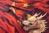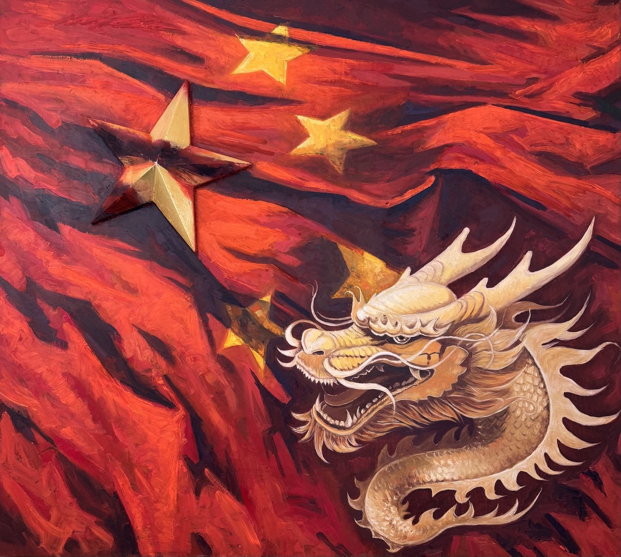 On the red canvas, golden five-pointed stars stand out clearly. Their stylization (one of the stars is three-dimensional, possibly made of plaster) refers to the symbolism of the PRC. The fusion of the mythological emperor-dragon with revolutionary stars creates a powerful political-cultural commentary.