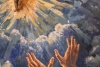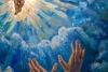 В нижней части картины изображены две реалистично прорисованные руки, протянутые вверх, словно в мольбе или предвкушении. Тёплый оранжево-коричневый оттенок кожи резко контрастирует с холодными синими и белыми тонами облаков, подчёркивая земную природу молящегося.