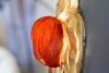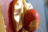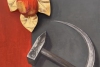 Композиция разделена на две плоскости. На красном фоне размещено скульптурное изображение золотого яблока с листьями — символ библейского грехопадения, искушения и божественного начала. Противоположную сторону занимает серый, холодный фон с изображением серпа и молота — узнаваемого атрибута советской идеологии. Этот контраст между «золотым» природным символом и «железным» символом политического строя подчеркивает фундаментальную несовместимость веры и догматизма.