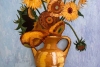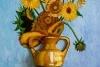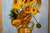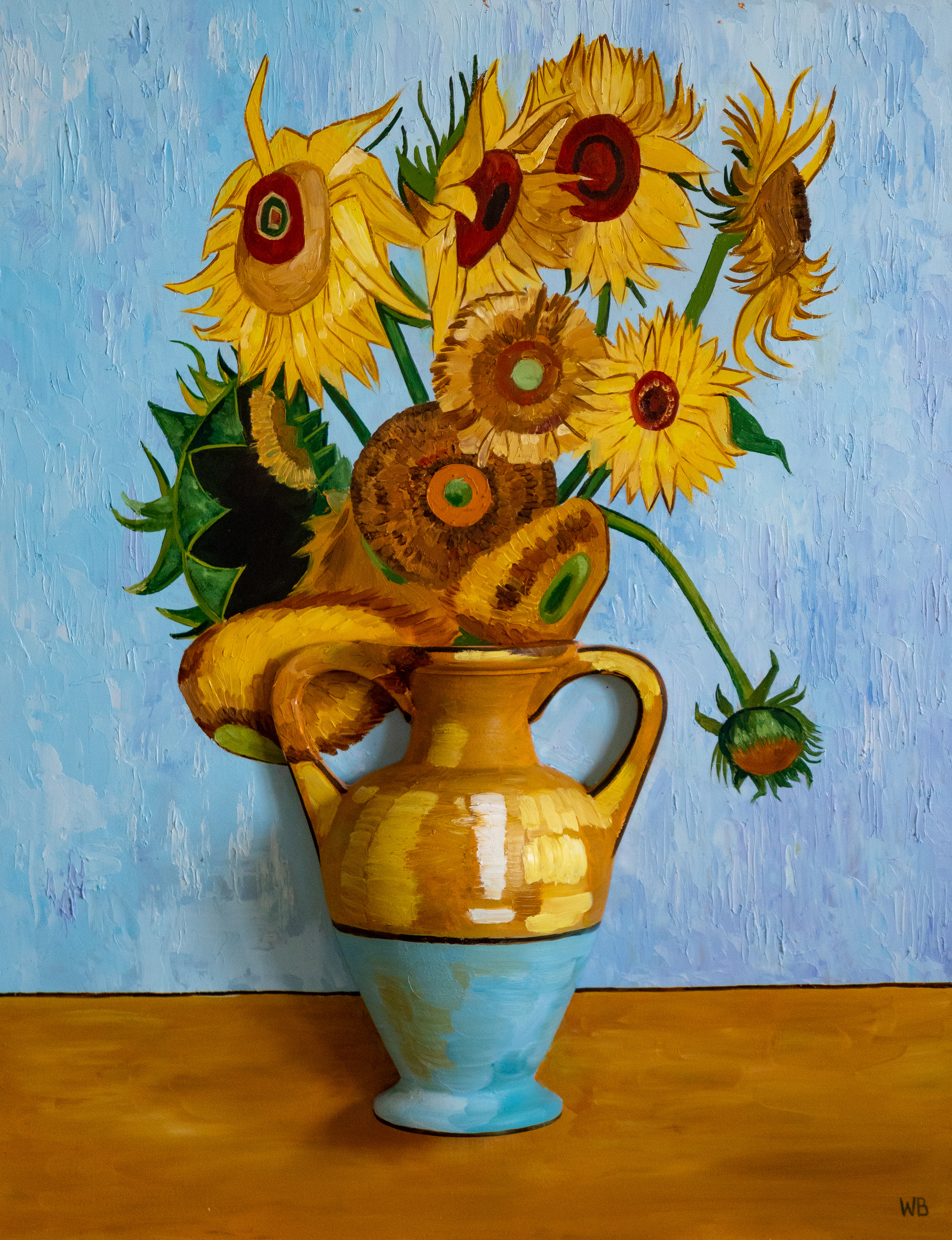 В центре полотна – пышный букет подсолнухов, словно вырывающихся из золотистого кувшина. Яркие, солнечные цветы, выполненные с характерной для Ван Гога экспрессией, создают ощущение энергии и жизненной силы. Однако Walerij Baranow добавляет к ним новые элементы, делая подсолнухи более объёмными, почти скульптурными, благодаря использованию гипса. Золотая поталь, добавленная в детали, придаёт цветам особое сияние, делая их поистине “солнечными”.