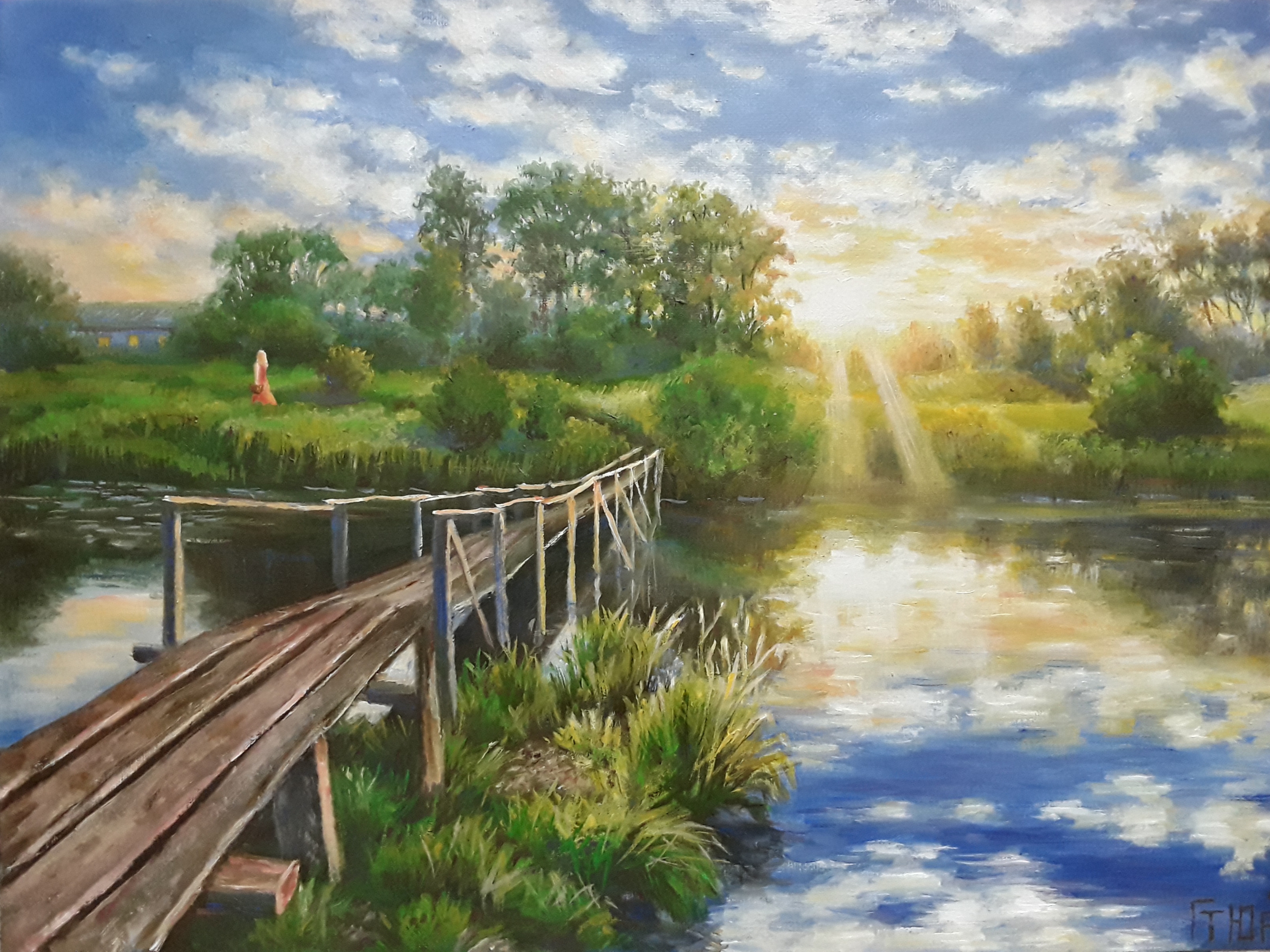 The painting is filled with radiance, silence, and tranquility! The water in the river lies still, like a canvas in a frame. The little bridge connects the banks like a ribbon—the left bank, the right bank. The fading glow of the long day delights with its beauty. The painting feels like a memory from childhood, creating a sense of presence! It is a portal to summer, to a world where there is room for the Beautiful!