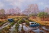 На картине изображён наш обычный пейзаж, который весной превращается в трудно проходимую пересечённую болотистую местность. Кустарники, высокие деревья с едва появившейся молодой листвой окружены землёй с участками травы и мутной воды. Дорог не видно, есть только направления.