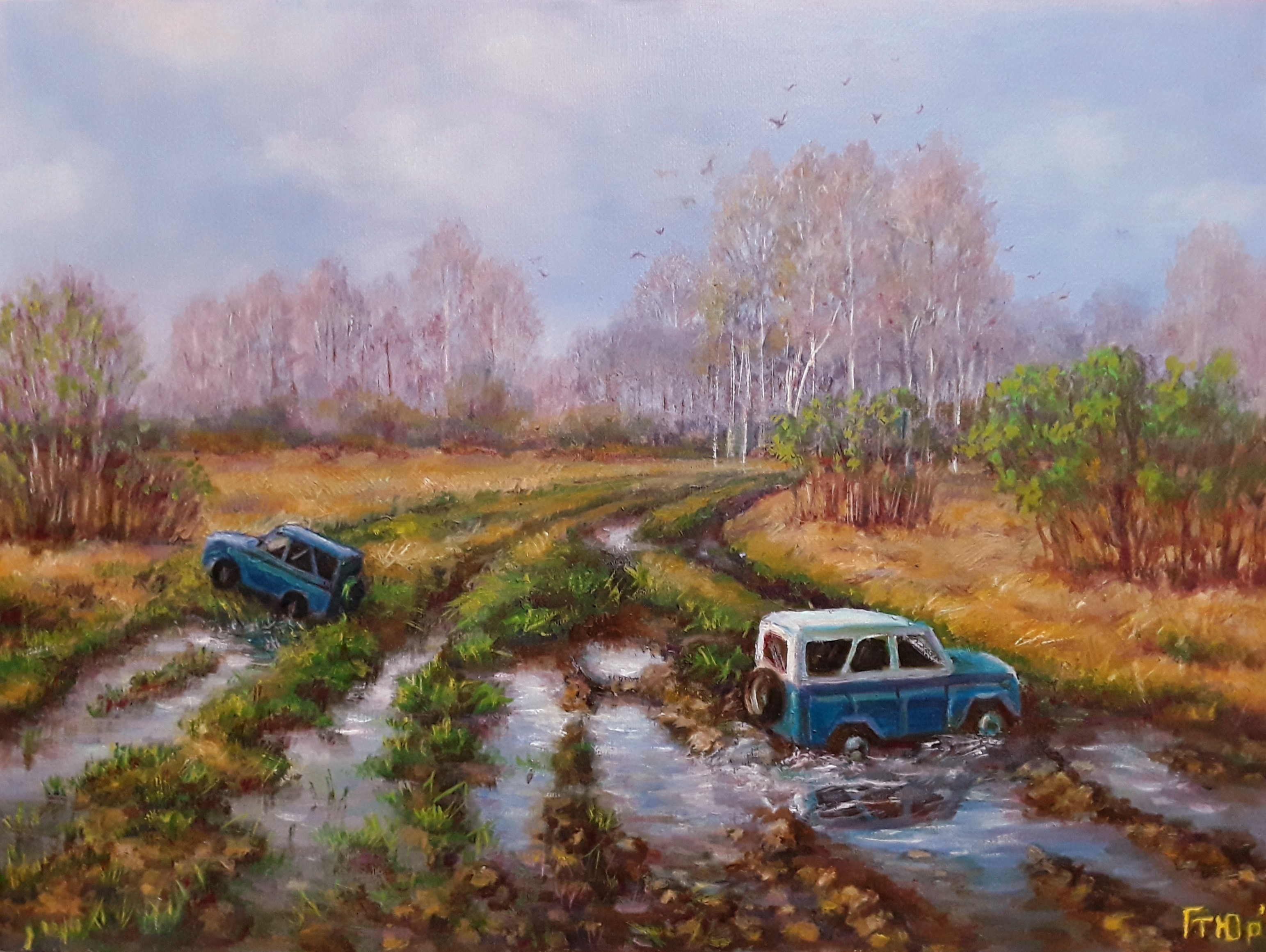 Автомобилисты ежегодно совершают новые попытки взять верх над природными явлениями, даже устраивают гонки. Кто же быстрее преодолеет препятствия? Синяя машина слева, наклонённая и частично погружённая в мелководье, или синий фургон с белой крышей, застрявший в более глубокой воде справа? Надеюсь, победит дружба или… весенние дороги!